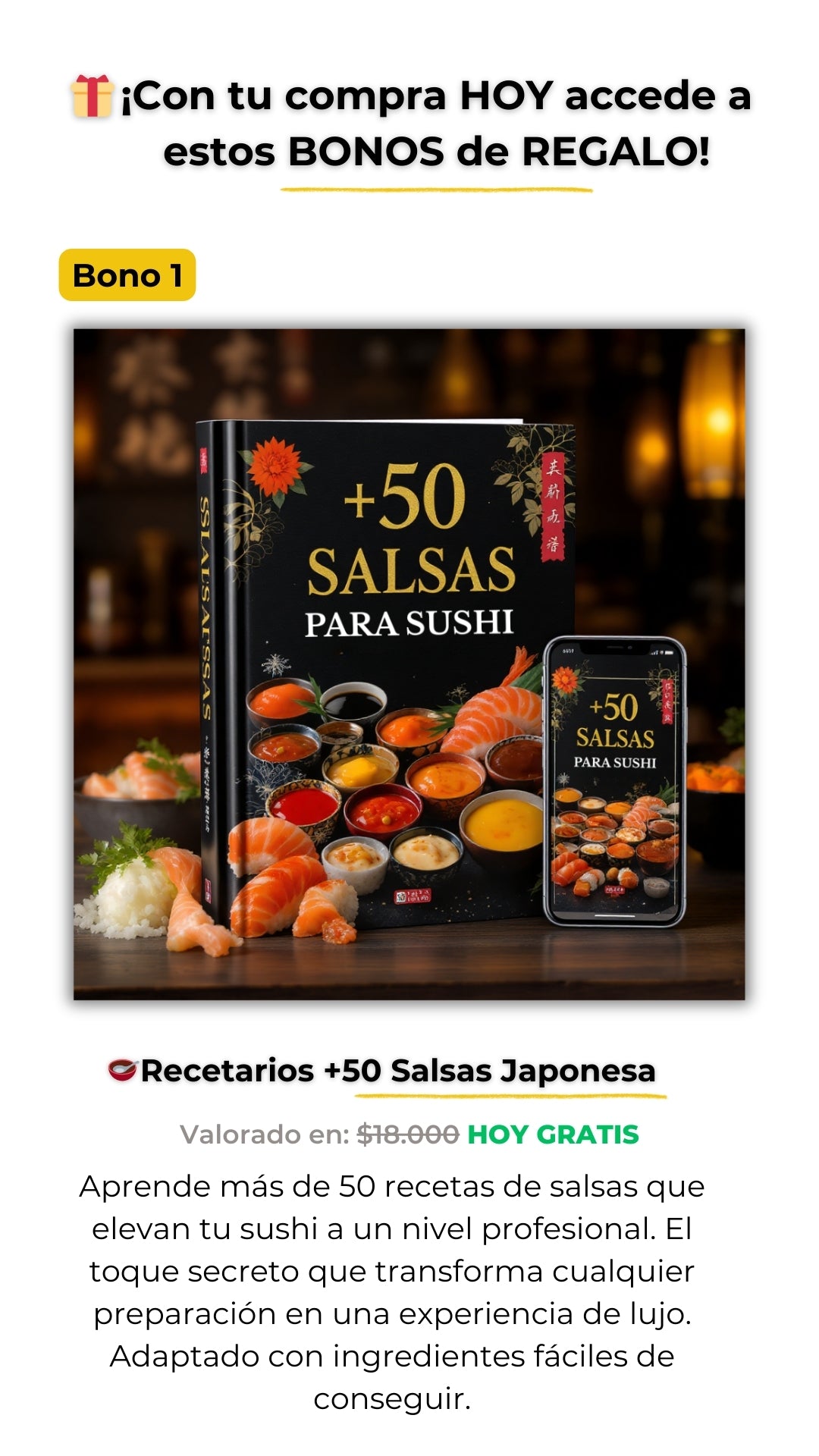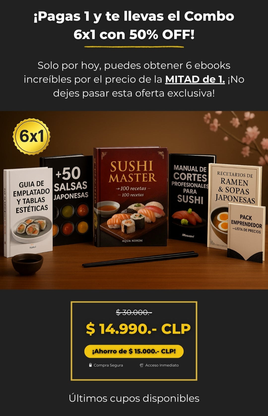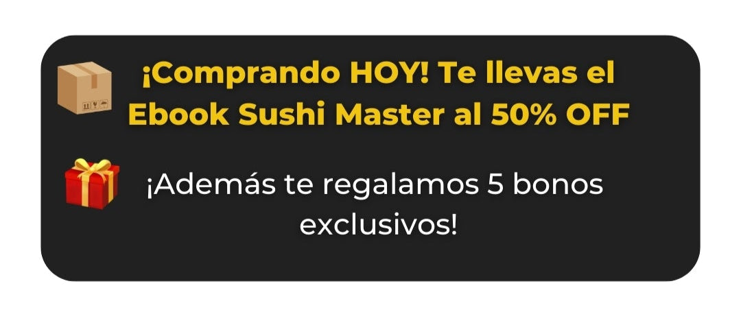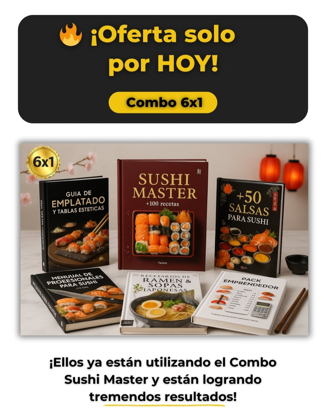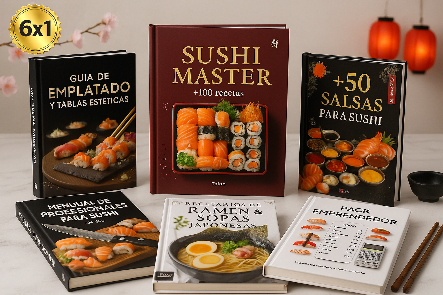 El Combo Sushi Master 6x1 es una oferta exclusiva que incluye 1 ebook y 5 bonos adicionales digitales en formato PDF, descargables e inmediatos: