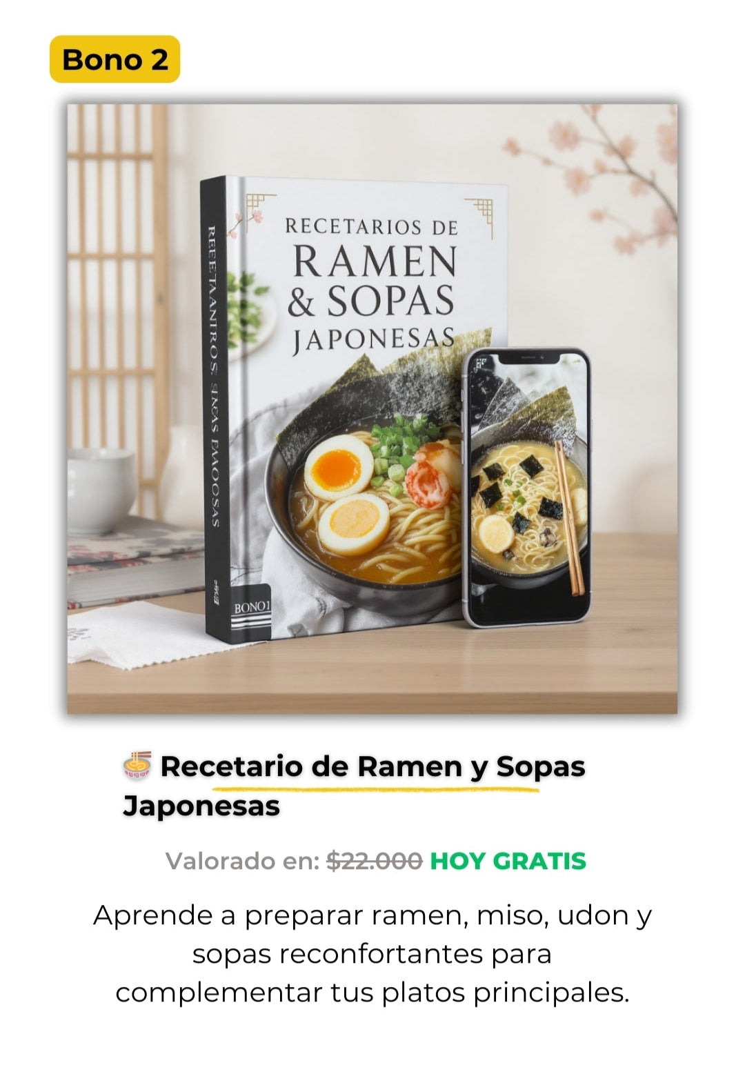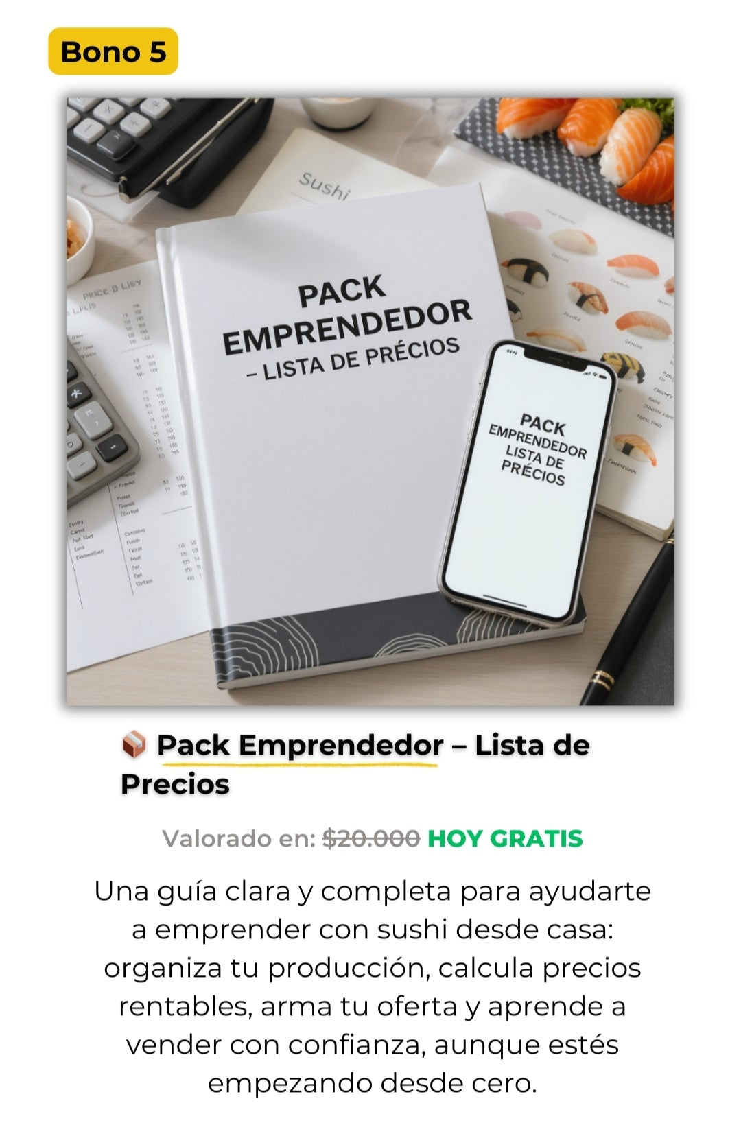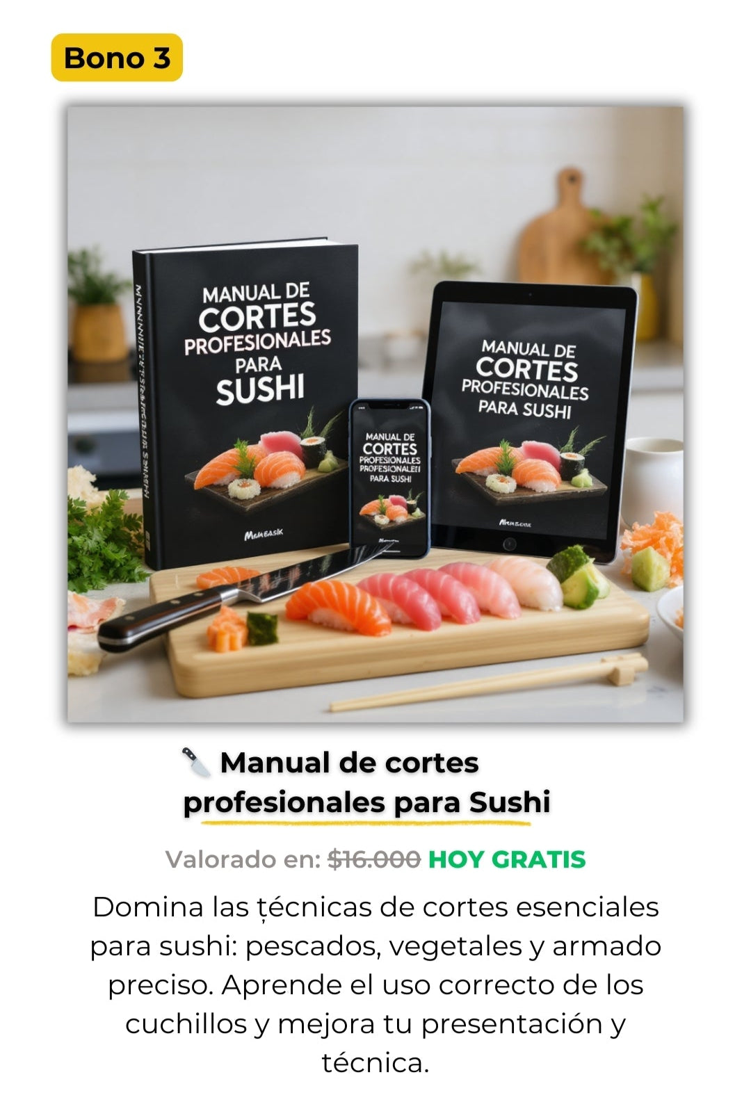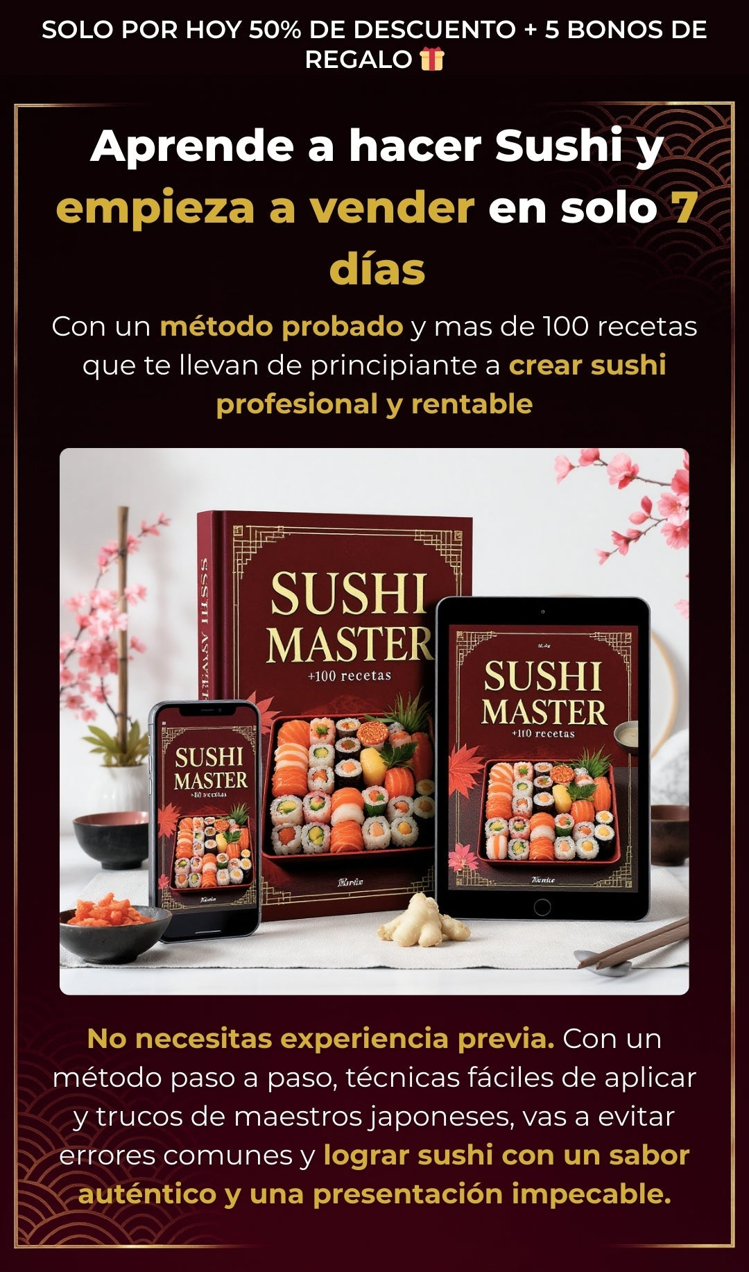 El Combo Sushi Master 6x1 es una oferta exclusiva que incluye 1 ebook y 5 bonos adicionales digitales en formato PDF, descargables e inmediatos: