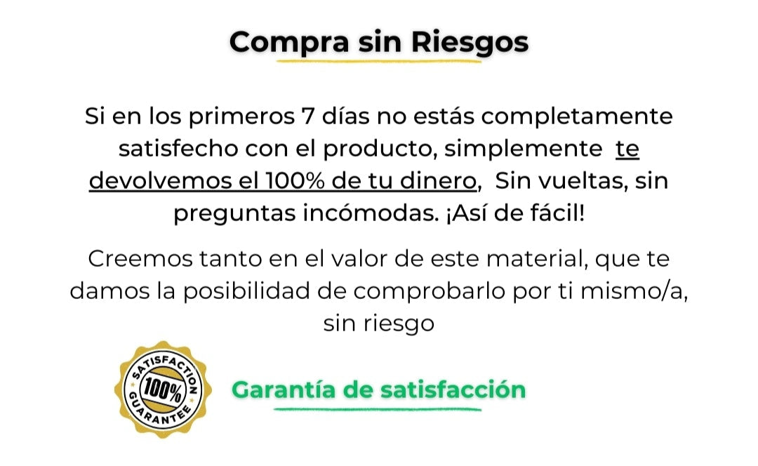 No te preocupes, ofrecemos una garantía de devolución de 7 días. Si no estás completamente satisfecho por cualquier razón, solo tienes que enviarnos un correo y te devolveremos el 100% de tu dinero. ¡Así de simple!