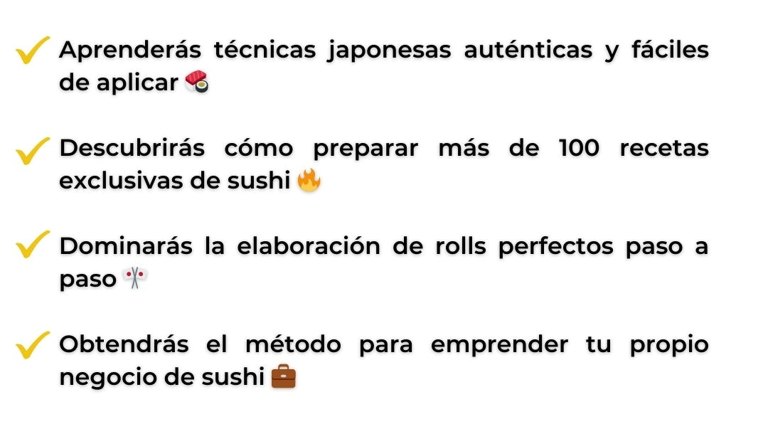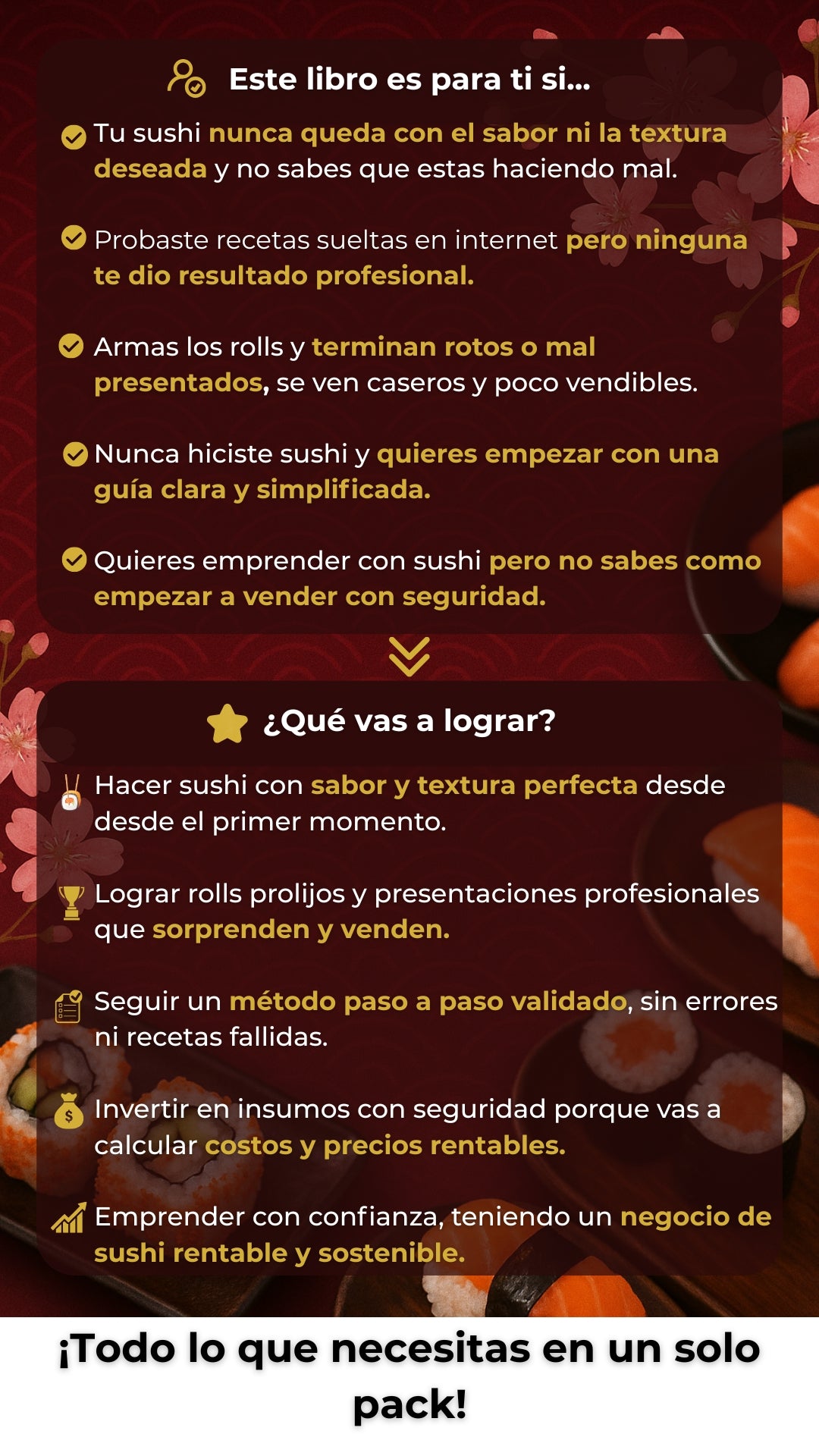 ¡Claro! Los ebooks están diseñados para llevarte de principiantes a experto. Cada receta tiene instrucciones paso a paso y está acompañada de imágenes claras. No necesitas ser un experto para hacer sushi profesional.
